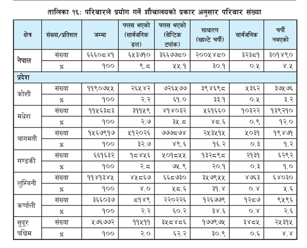प्रदेश अनुसार मधेश प्रदेशमा शौचालय नभएको परिवार सबैभन्दा बढी १२ प्रतिशत देखिएको छ भने लुम्बिनी प्रदेशमा ५.६ प्रतिशत रहेको छ । यस्तै सुदूर पश्चिममा ४.४ प्रतिशत, कोशीमा ३.२ प्रतिशत, कर्णालीमा २.६ प्रतिशत, बागमतीमा १.२ प्रतिशत र गण्डकीमा १ प्रतिशत परिवार शौचालय नभएका छन् । एक दशक अघि भएको जनगणना २०६८ मा शौचालयको पहुँच नभएको परिवार ३८.२ प्रतिशत थियो ।